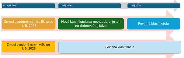 V prípade nových zmesí sú termíny povinnej klasifikácie posunuté na máj 2026. Ak zmes uvediete na trh pred 1. májom 2026, plnenie povinnosti klasifikácie do nových tried sa vyžaduje až od 1. mája 2028.