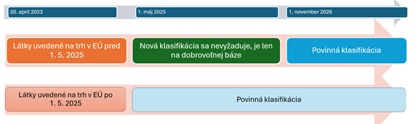 V prípade nových látok na trhu sa prechodné obdobie už skončilo a platí povinnosť klasifikácie aj do nových tried nebezpečnosti. Ak ste však látku na trh uviedli už pred 1. májom 2025, nová klasifikácia a označovanie sa vyžaduje až od 1. Novembra 2026.